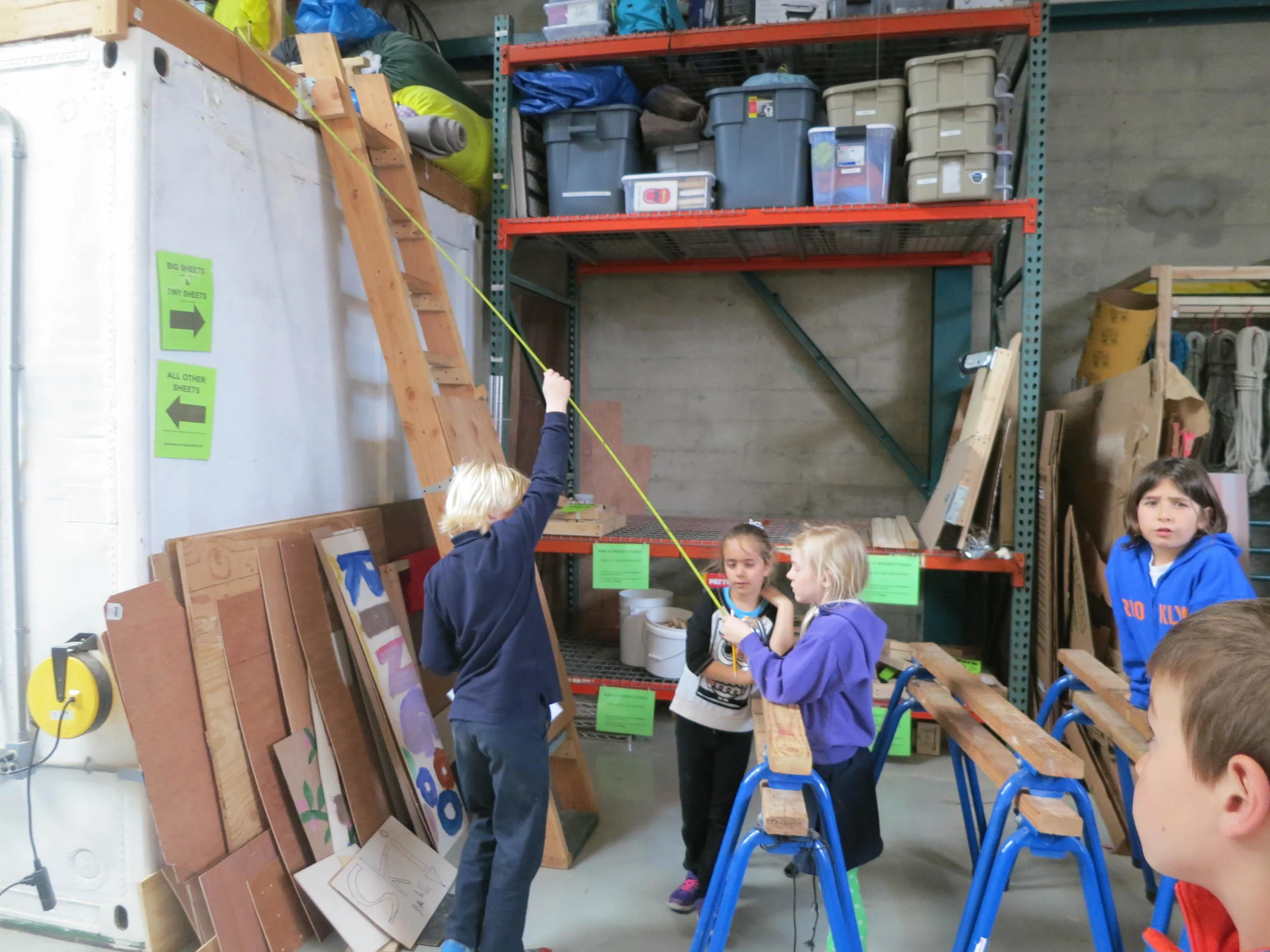 While the track team perfected their iterations, another group of Tinkerers worked on the master plan -- which, of course, included a proposal to start the ball run on top of the chop saw room. Measurements were necessary to perfect the design proposal, which includes a couple of zig-zags through the shop.