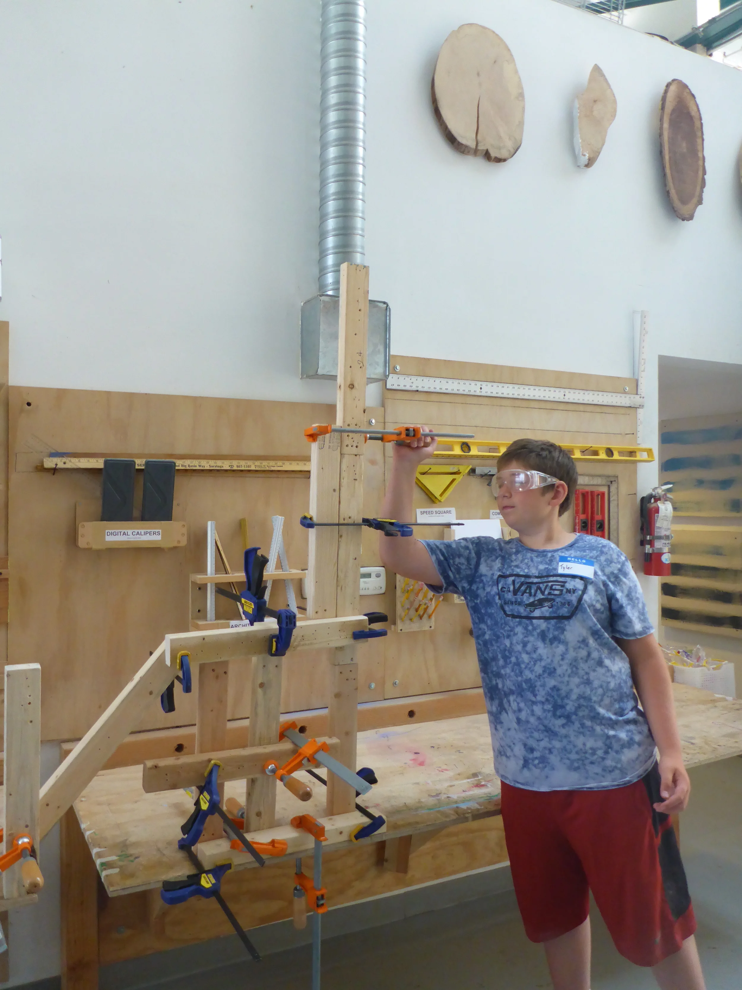 During tool training, Tyler demonstrates how clamps are a great substitution for additional hands in the absence of ten conveniently unoccupied humans.