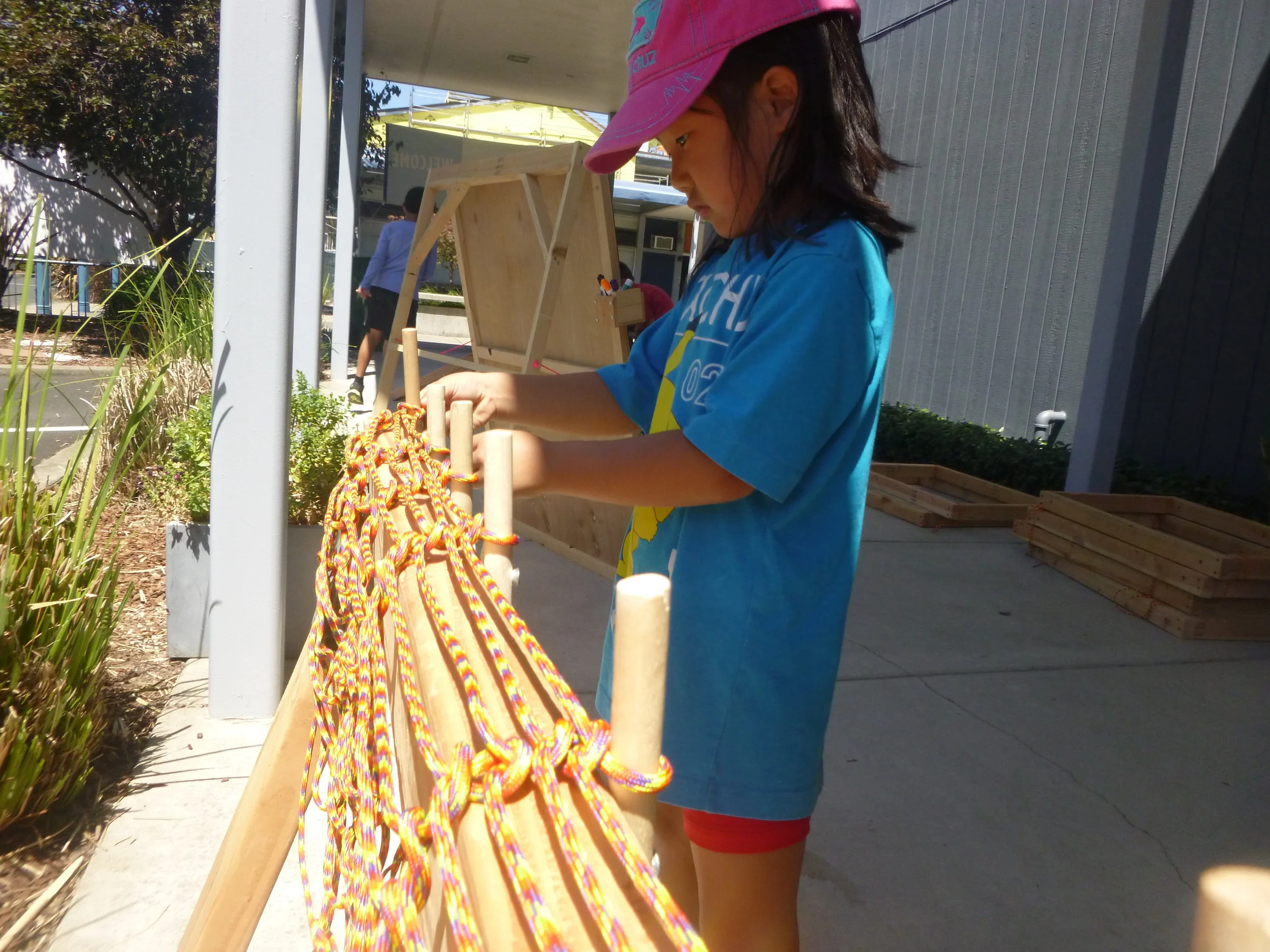 Meanwhile, Beth set up a Tinkering School first! Our centipede-spider-insect-creature needs a web, and we started to make one. Beth and a team set up a giant loom and taught one another how to weave a web! The pictures explain much better than I every could.
