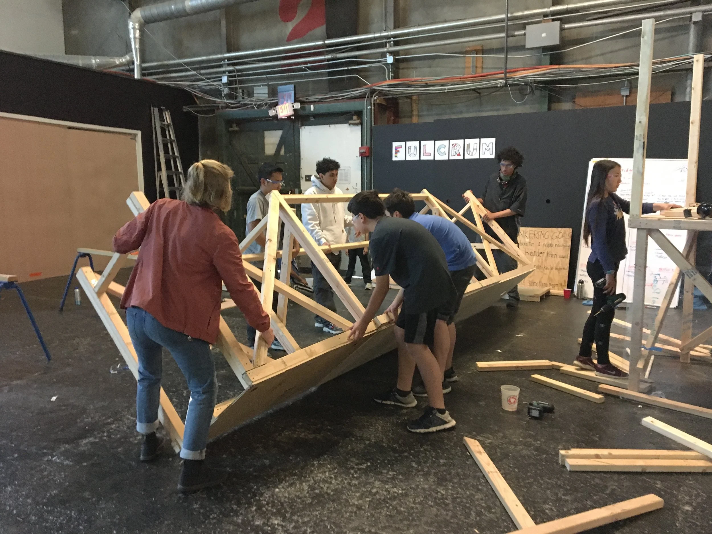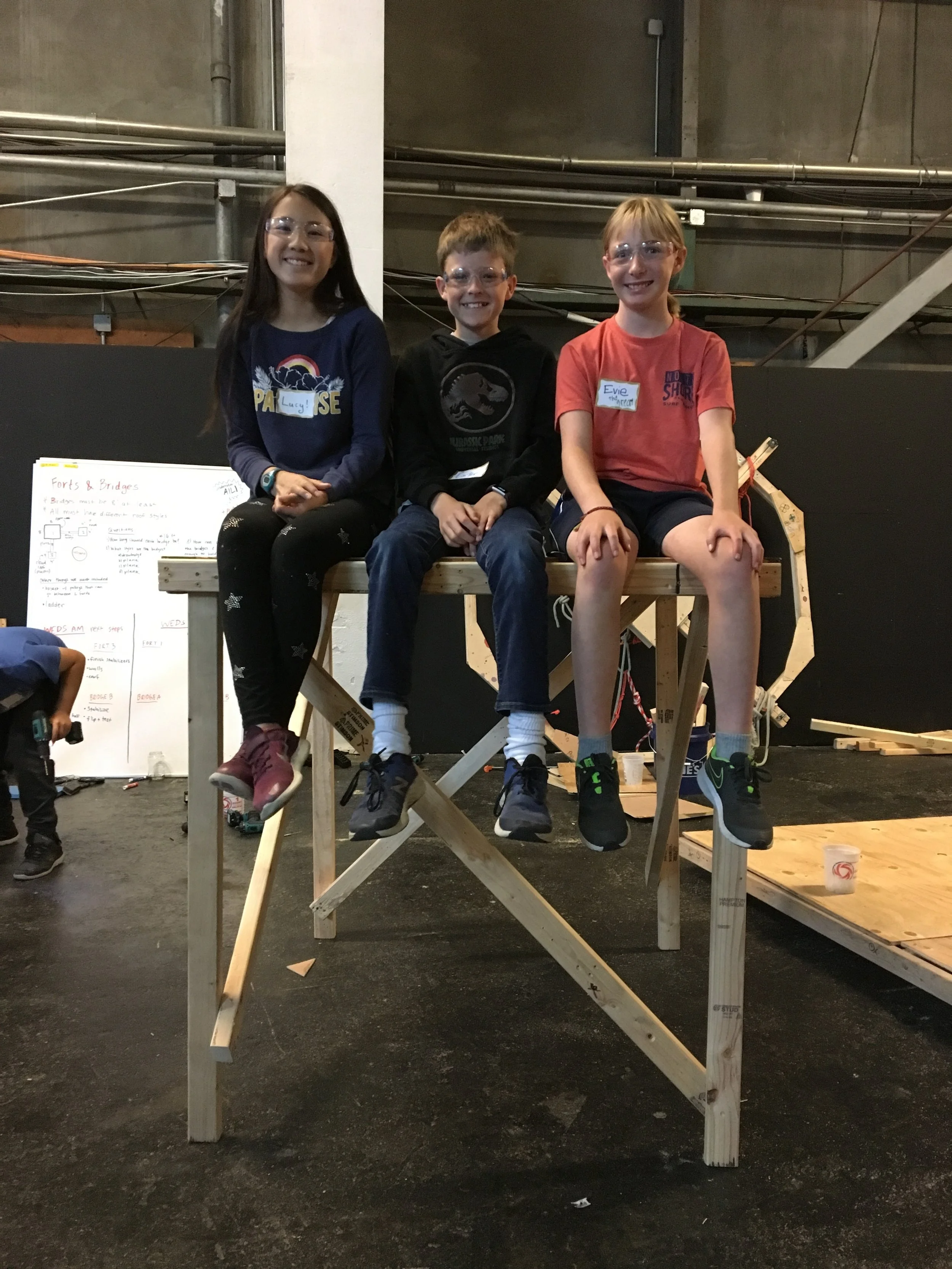 The forts and bridges team got most of their project off the ground today! Literally. Smaller sub-groups working on two of the different forts and bridges completed the stilts that hold up their structures, and the structures were able to be flipped into their correct positioning. From there, it was testing the structural integrity of their designs, putting actual human weight on the platforms and adjusting weaker spots.