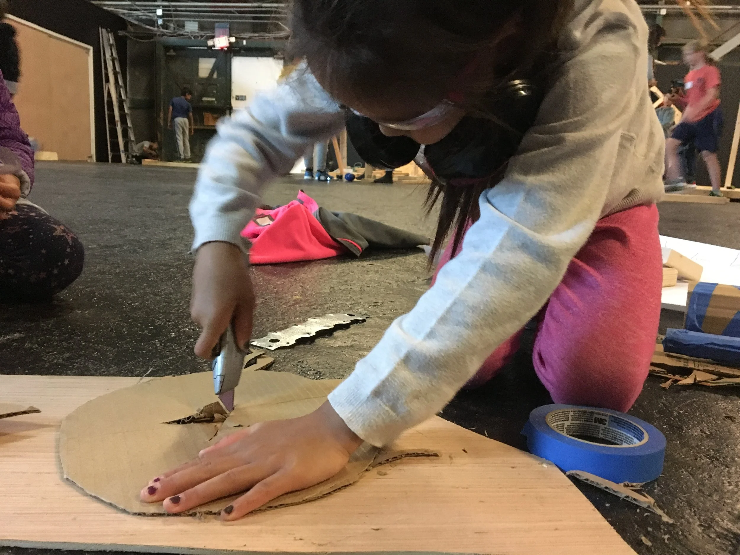 Those of us working on the giant volcano spent the morning brainstorming and prototyping a launching mechanism for the balloon lava. We settled on a human-powered bicycle crank mechanism that will spin a paddle to flip the balloons into the air. In order to understand the concept better, we created a cardboard version first. This prepared us to create the right pieces out of wood, to ensure the mechanism will work. Meanwhile, the rest of the team continued creating the external structure of the volcano, as well as the tunnel within that will funnel the balloons when they are launched.