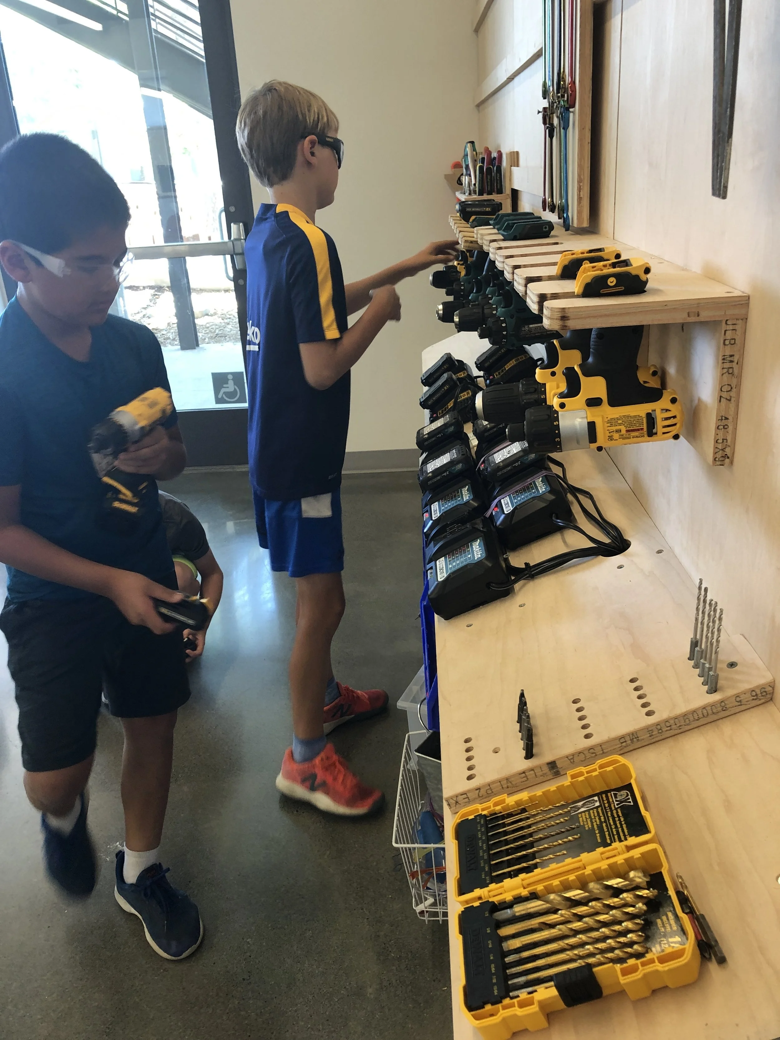 Tinkerers get familiar with our tool wall and can find what they need throughout the day. We also “reset” our spaces each morning and afternoon after we build. This lets us practice one of our goals, to collaborate and make friends.