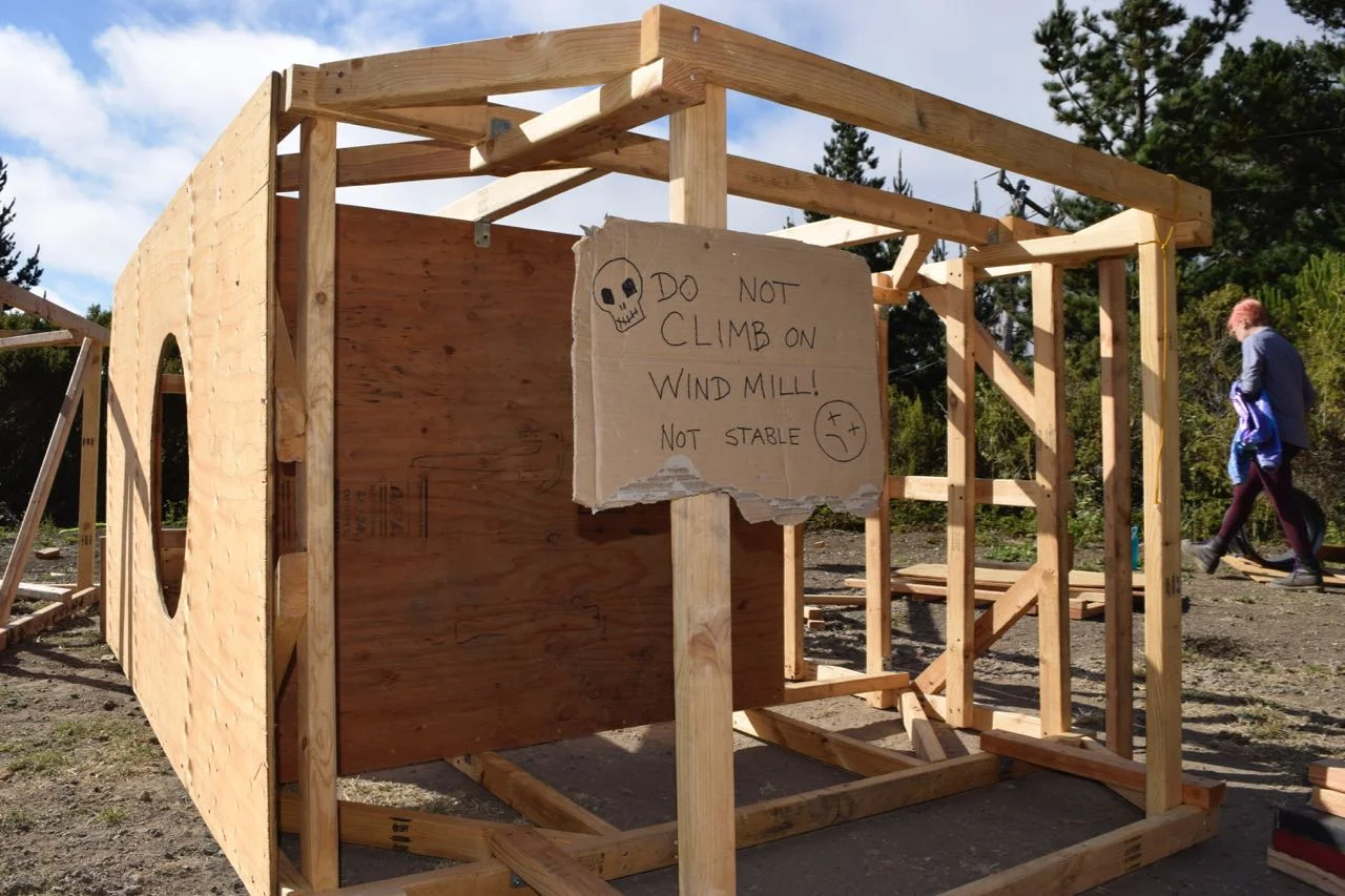 The Wind Power team made several renovations to the existing windmill in preparation for their base addition. Originally they had planned on jacking up the existing structure but found that if they removed some non-essential wood they could make it light enough to lie it down, attach the two base pieces they made, and do a windmill raising tomorrow.