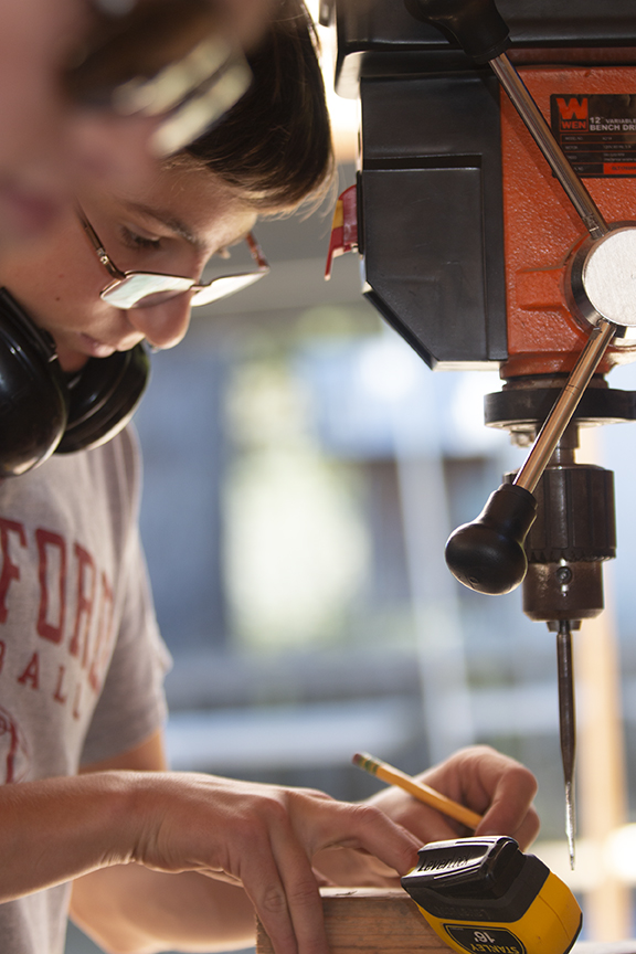 Senior Tinkerers, Marshall and Katherine, plan a six-foot-high ramp build their team is building to propel their tricycle.